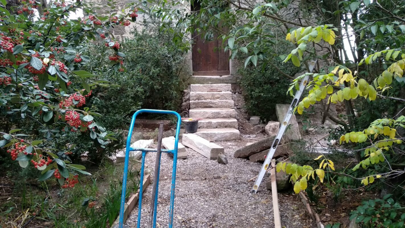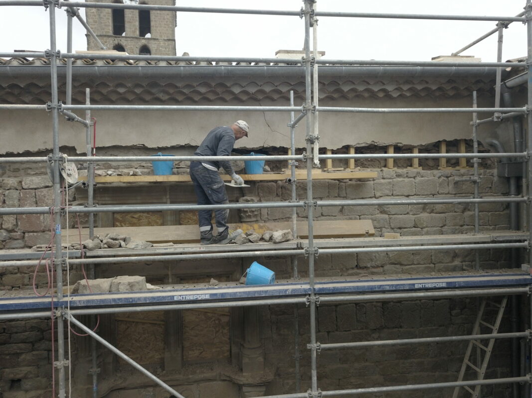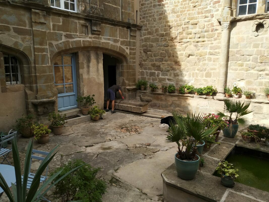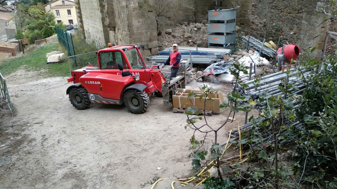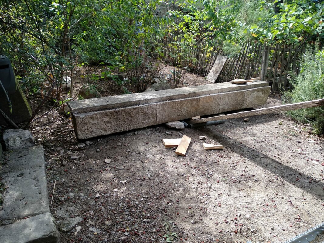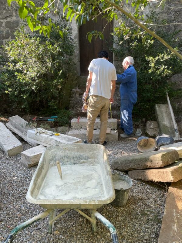 Lorsqu’on avait abaissé la citerne il y a un an, une pierre de 1,3 tonnes avait été laissée dans la cour. Afin de faciliter la mise en place des échafaudages, nous avons décidé de la changer de place. On a fait à deux comme pour les pyramides d’Egypte, les géants de l’île de Pâques, ou les Taulas de Minorques, en les roulant sur le sol…