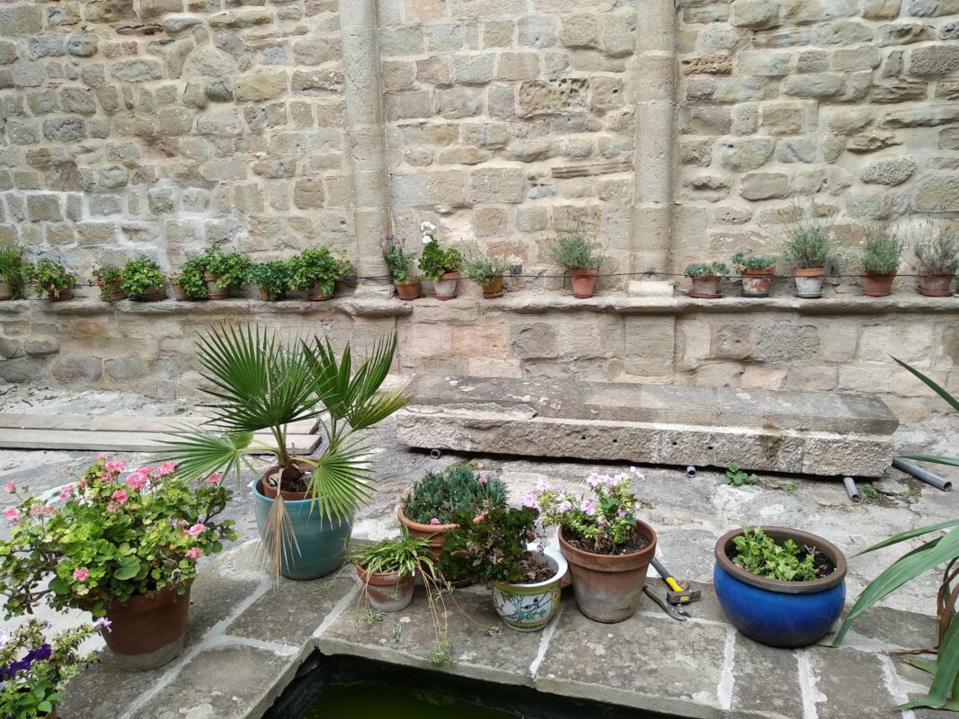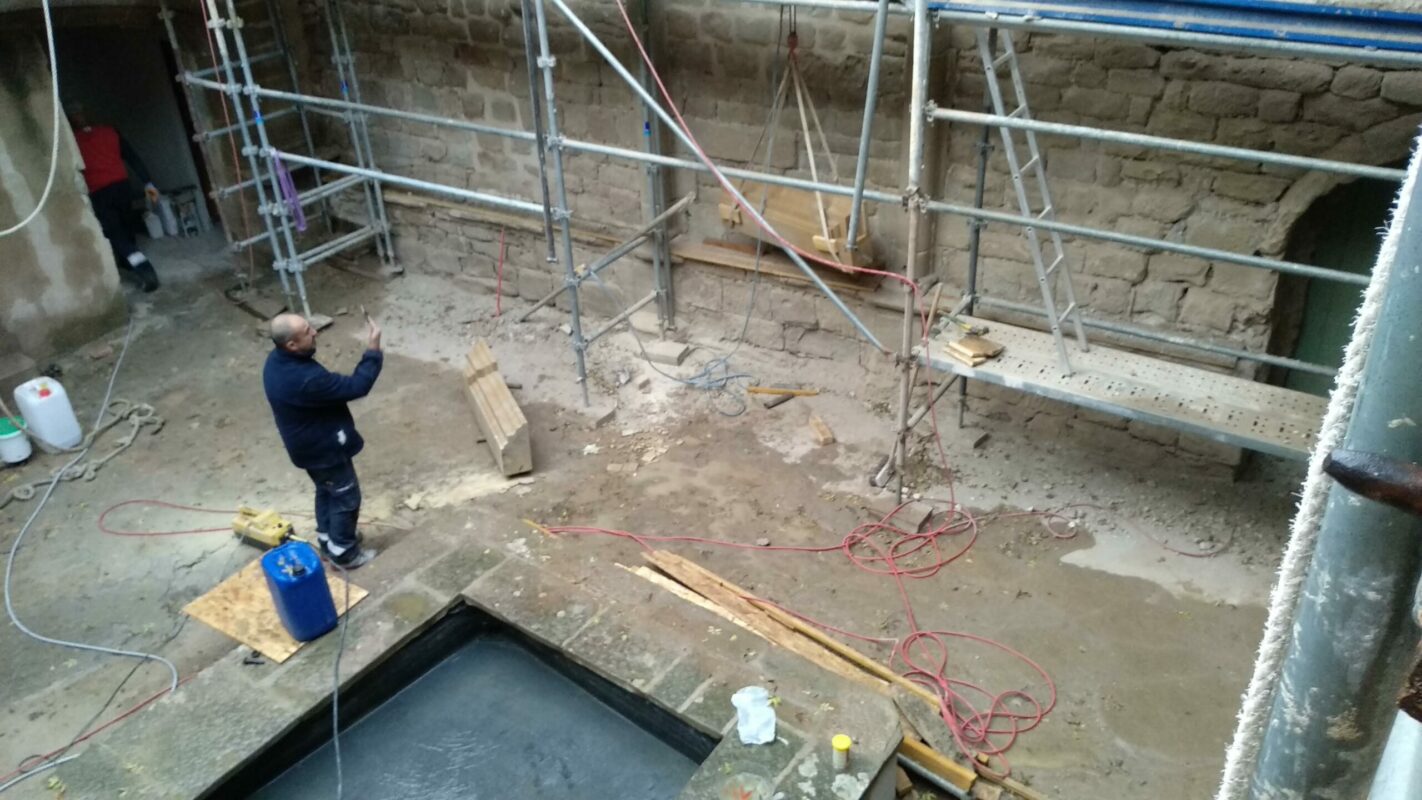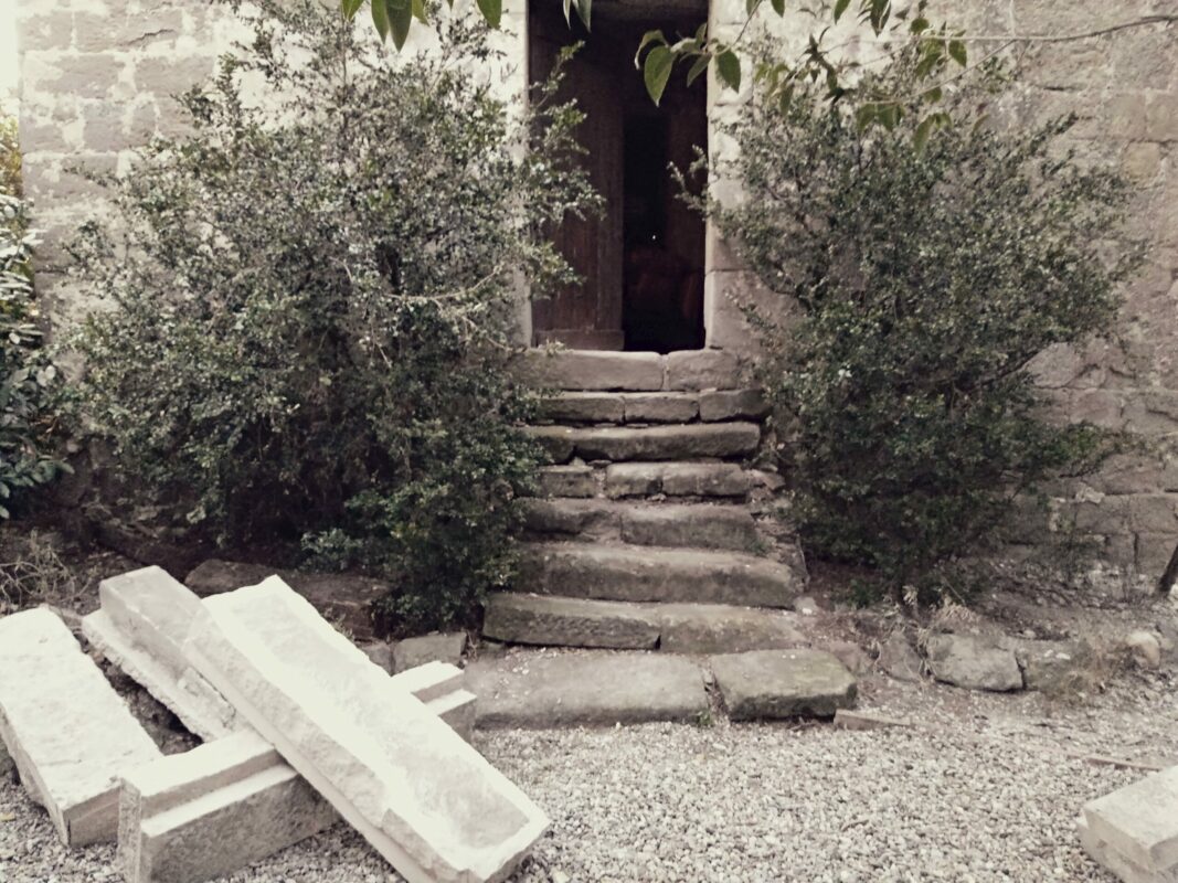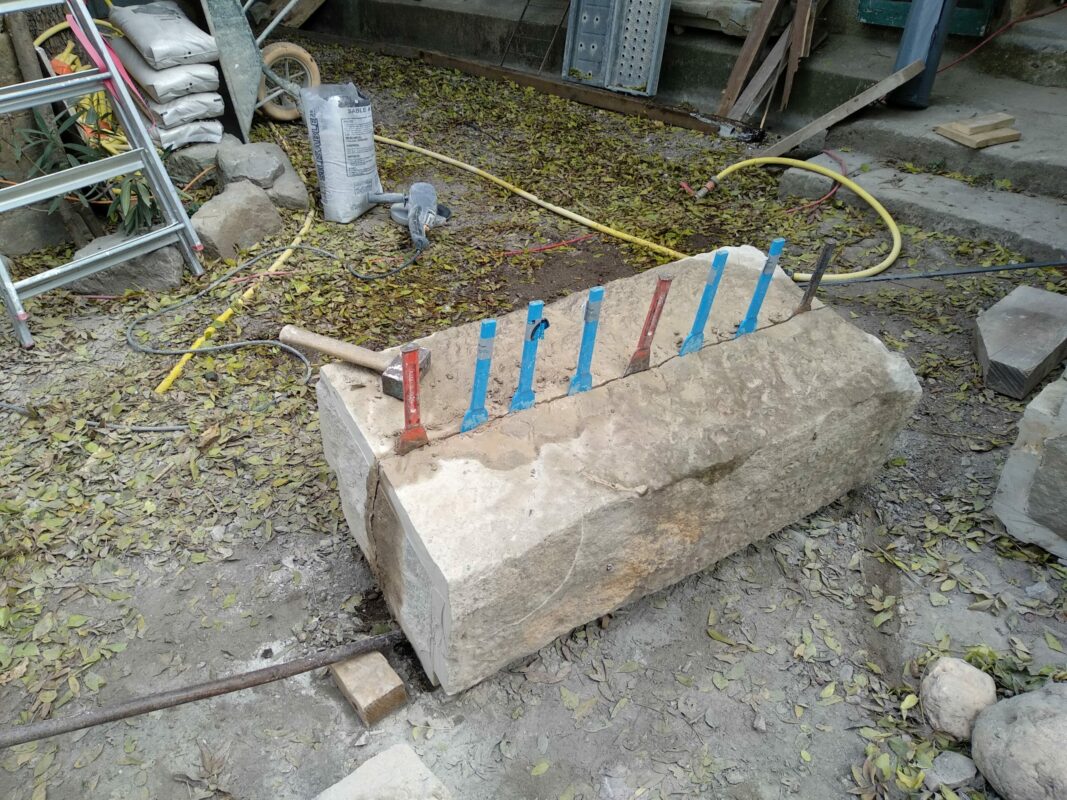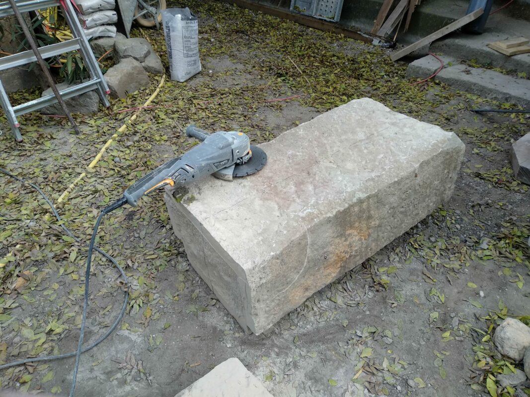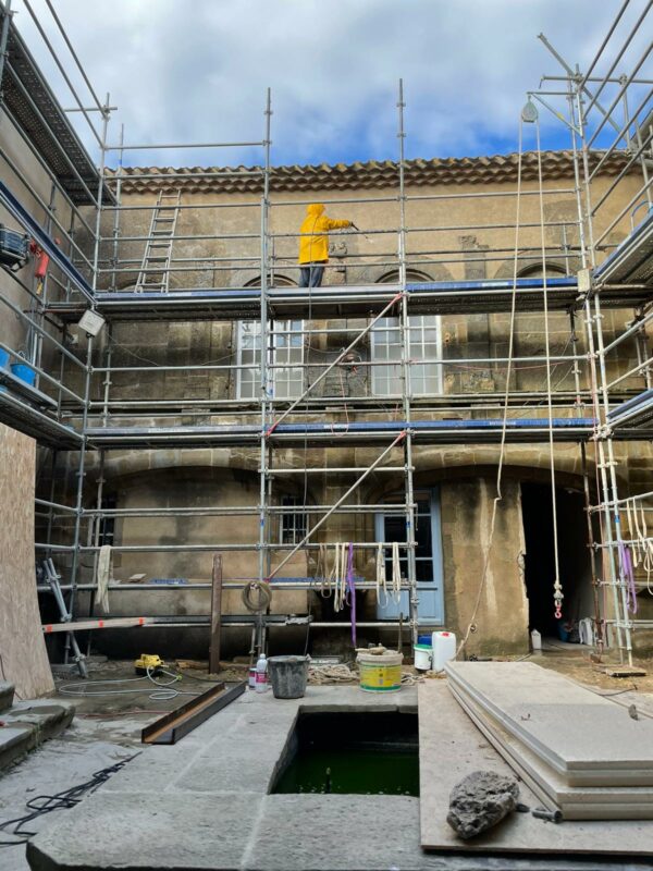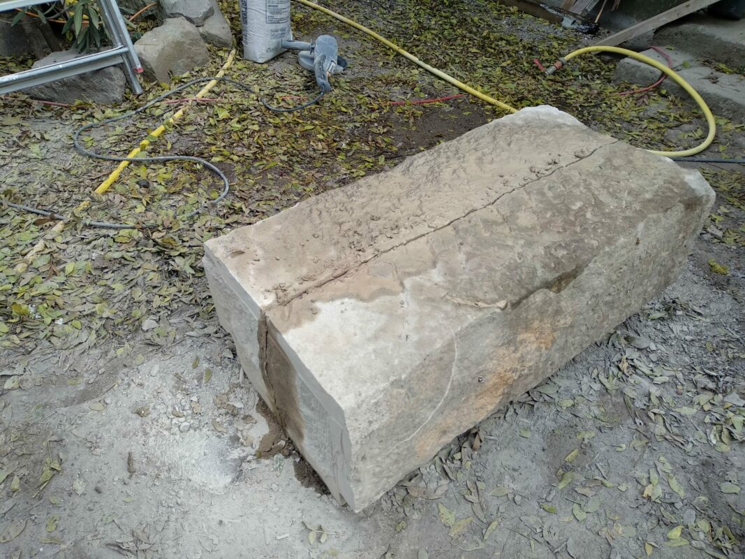Lorsqu’on avait abaissé la citerne il y a un an, une pierre de 1,3 tonnes avait été laissée dans la cour. Afin de faciliter la mise en place des échafaudages, nous avons décidé de la changer de place. On a fait à deux comme pour les pyramides d’Egypte, les géants de l’île de Pâques, ou les Taulas de Minorques, en les roulant sur le sol…