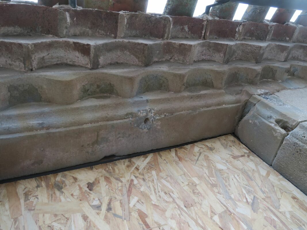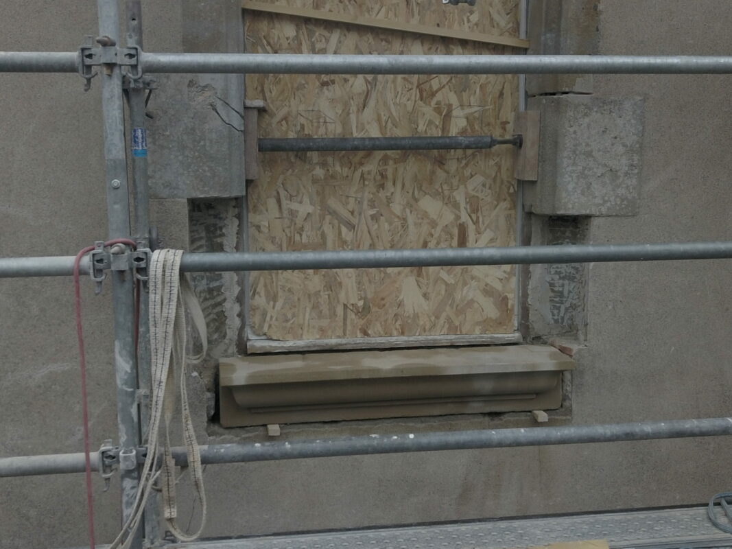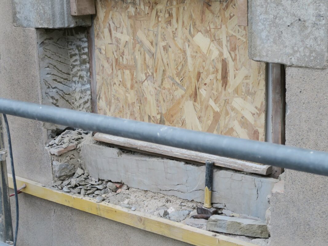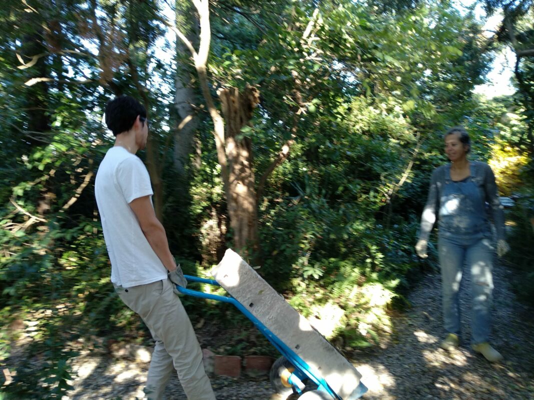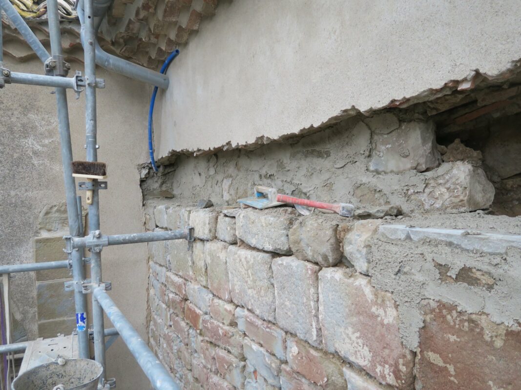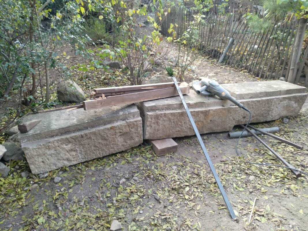 Lorsqu’on avait abaissé la citerne il y a un an, une pierre de 1,3 tonnes avait été laissée dans la cour. Afin de faciliter la mise en place des échafaudages, nous avons décidé de la changer de place. On a fait à deux comme pour les pyramides d’Egypte, les géants de l’île de Pâques, ou les Taulas de Minorques, en les roulant sur le sol…