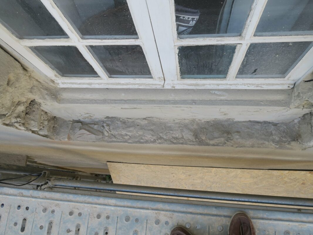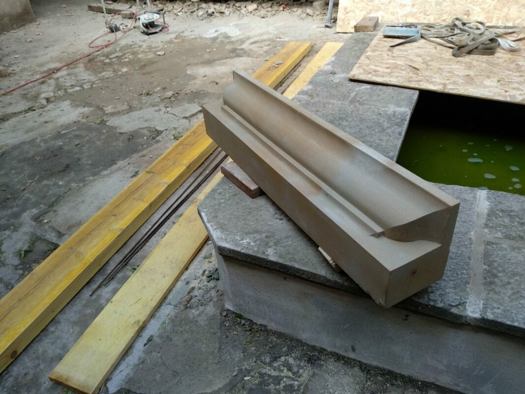 Un appui de fenêtre en pierre tout frais sorti de l’atelier a été posé sur la margelle du bassin.